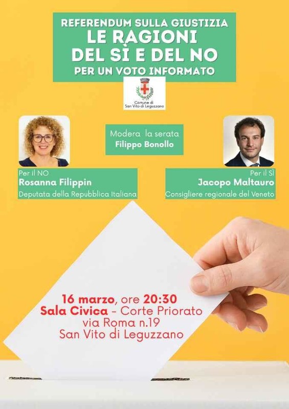 Cos'è Incontro gratuito Moderatore: FILIPPO BONOLLOParteciperanno:Per il NO: ROSANNA FILIPPIN - Deputato della Repubblica ItalianaPer il SI: JACOPO MALTAURO - Consigliere Regionale del Veneto